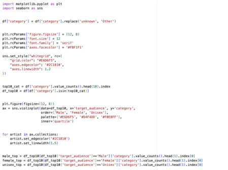 График демонстрирует распределение десяти самых популярных категорий ароматов между целевыми аудиториями. Каждая «скрипка» отражает, какие категории чаще встречаются в рамках конкретной аудитории, и в итоге выделяется наиболее характерная категория для каждой ца, позволяя сравнить предпочтения и позиционирование парфюмерии.