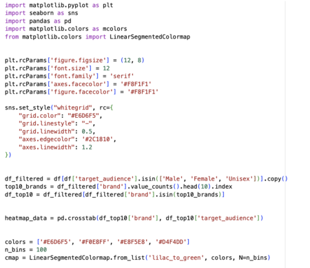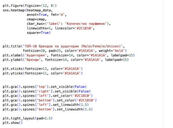 Этот график показывает, как распределяются парфюмы брендов между аудиториями (Мужская/Женская/Унисекс). Ячейки отражают, сколько ароматов каждого бренда ориентировано на конкретную группу, а цвет подчеркивает бренды с более сильным уклоном в сторону определённой аудитории, позволяя увидеть, кто делает ставку на мужские, женские или универсальные ароматы.