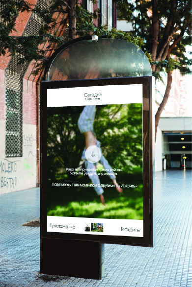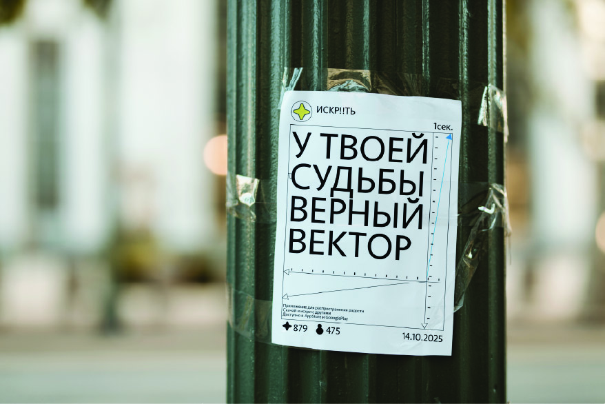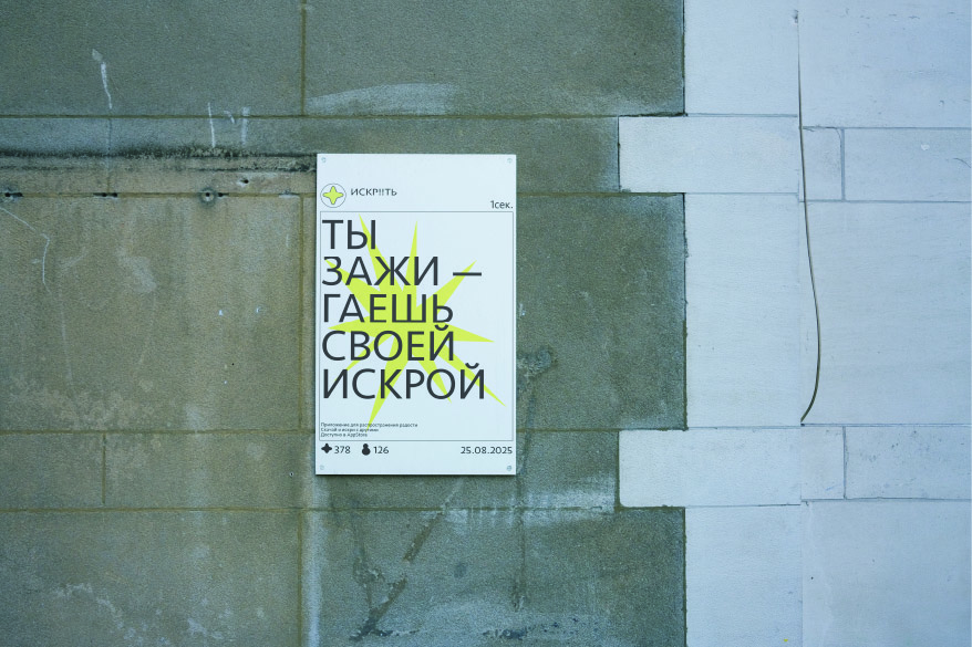 Каждый плакат это пост из приложения «искрить» с позитивным посланием. Так сам плакат становится небольшой повседневной радостью, в соответсвии с темой бренда Плакаты расположены в случайных местах улиц чтобы подчеркнуть случайность приятного момента