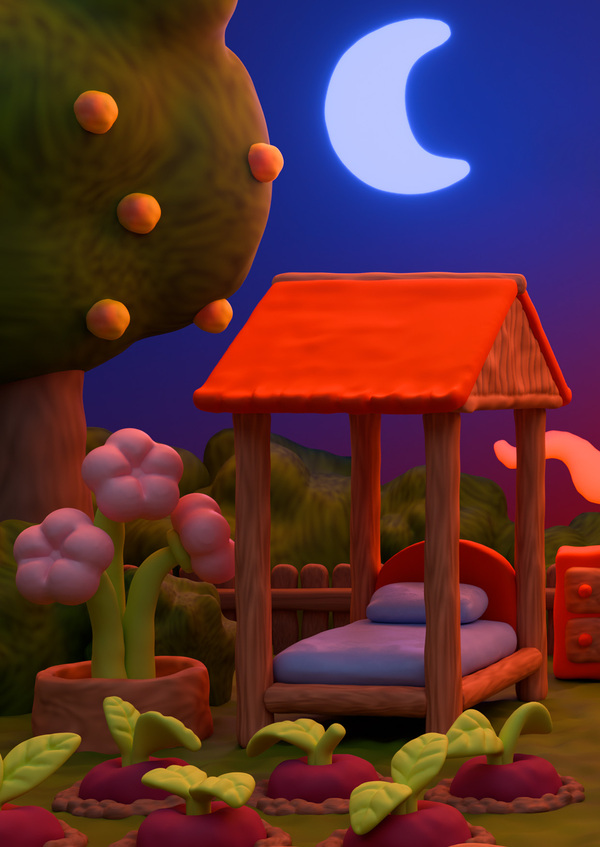 Дачный участок, вылепленный из мягких пластилиновых форм. Здесь день и ночь дружно уживаются вместе — в небе одновременно висят и луна, и солнце, создавая идеальный момент для рождения маленьких чудес.