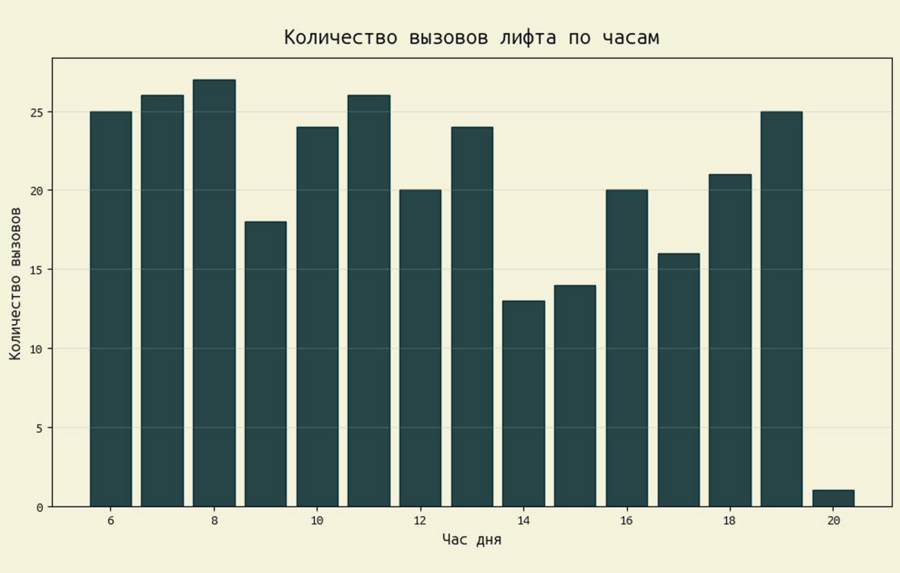 • Частотный анализ — использовался для подсчёта количества вызовов лифта по часам суток. Это позволило выявить суточные пики нагрузки и периоды наибольшей активности пользователей.