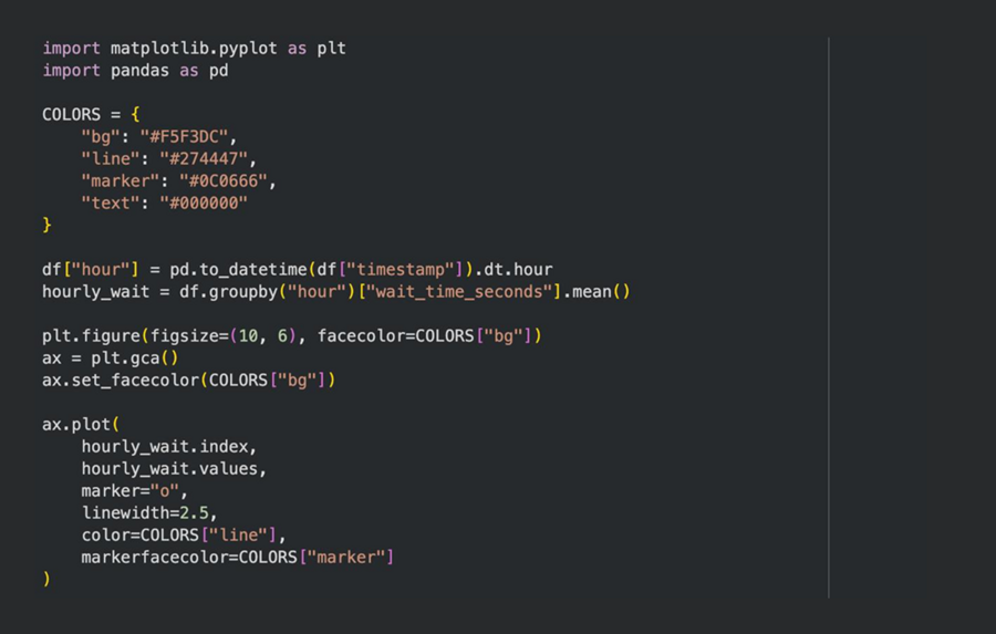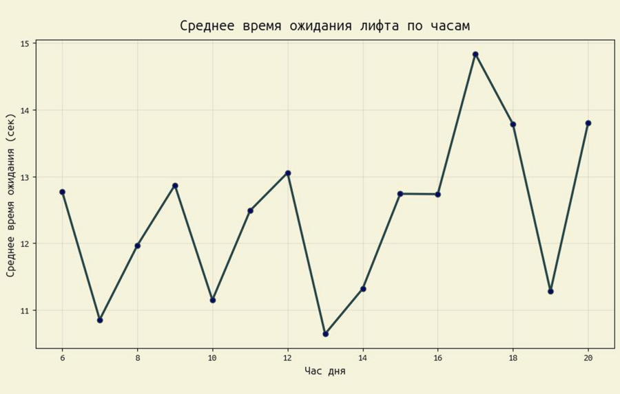 • Агрегационный анализ средних значений — применялся для расчёта среднего времени ожидания лифта по каждому часу дня. Такой подход позволил сопоставить интенсивность использования лифта с качеством обслуживания (временем ожидания).