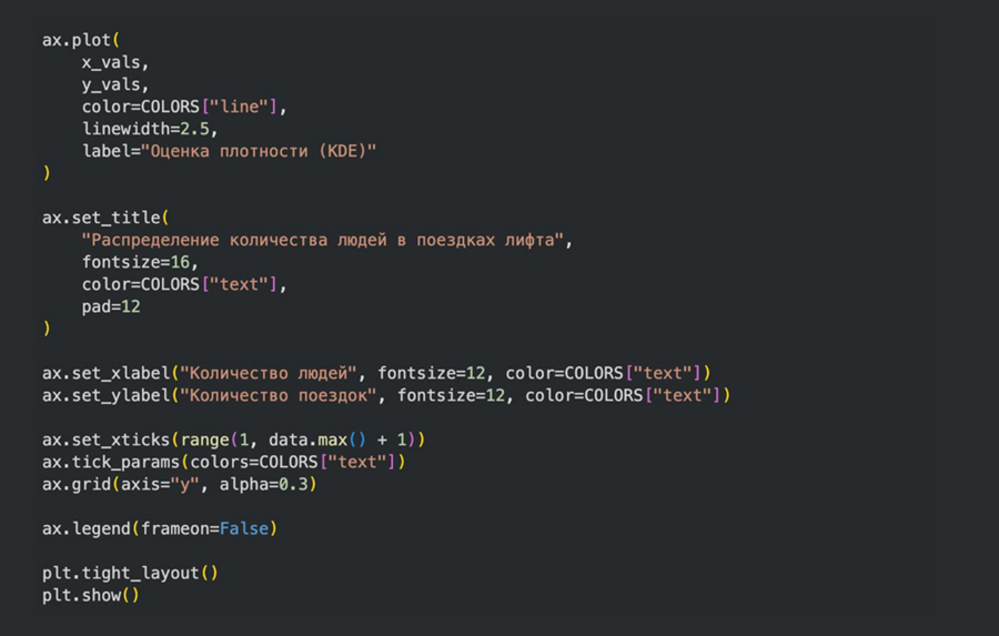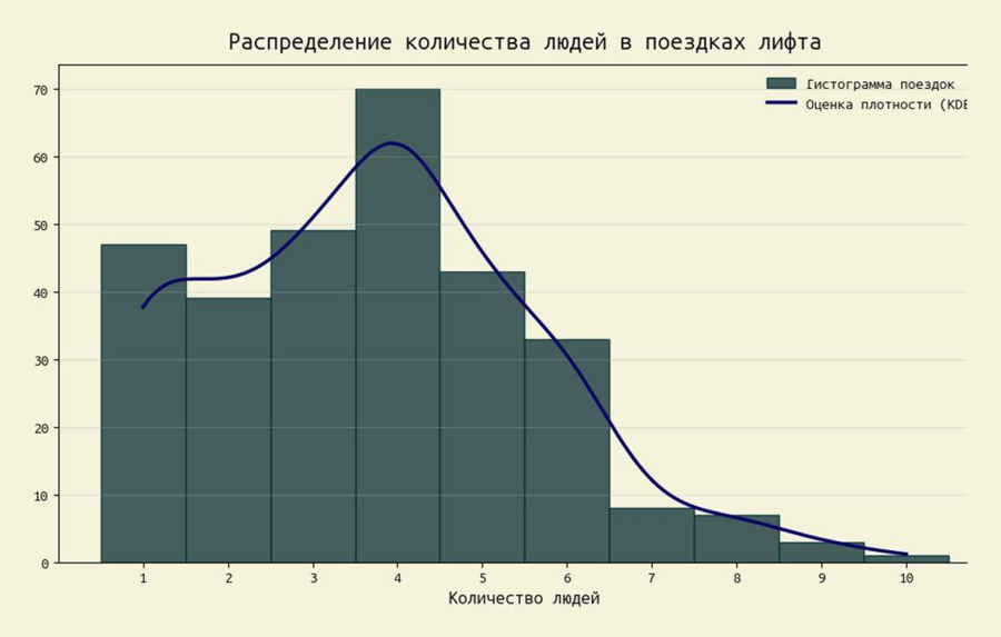Третий график показывает, сколько человек обычно находится в лифте во время поездок. Это гистограмма с линией плотности, которая помогает увидеть наиболее частые сценарии.