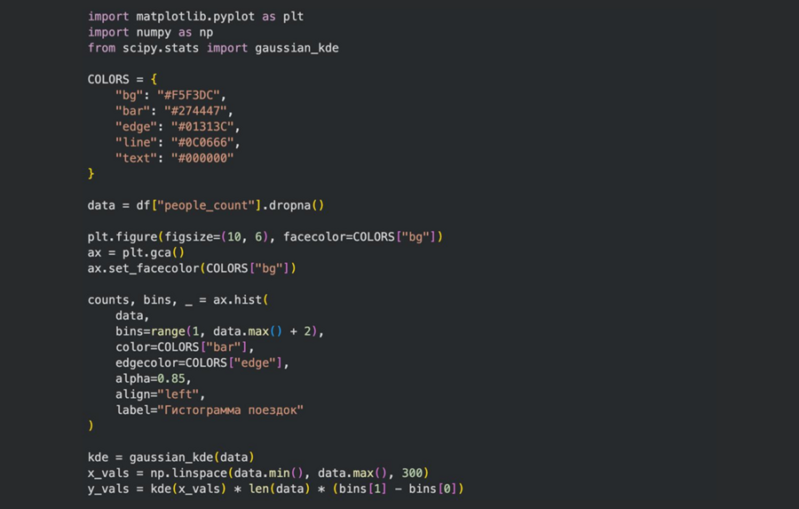• Анализ распределений — выполнен с помощью гистограммы количества людей в поездках. Дополнительно использовалась ядерная оценка плотности (KDE), что позволило оценить форму распределения и различить одиночные и групповые поездки.