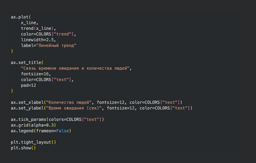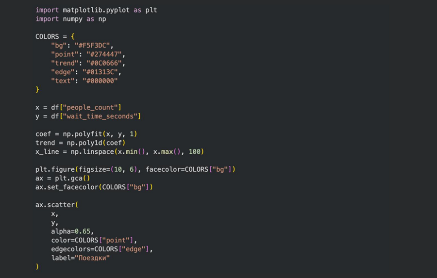 • Анализ взаимосвязей и трендов — реализован через диаграмму рассеяния времени ожидания и количества людей с построением линейного тренда. Это позволило выявить эффект увеличения времени ожидания при росте числа пассажиров (эффект «толпы»).