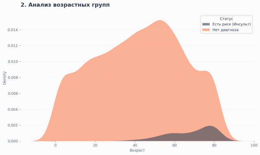 В свою очередь, график плотности показывает не только очевидный пик риска после 55 лет, но и тревожный «хвост» в зоне 40–45 лет. Это сигнал о том, что мониторинг нужно начинать раньше.