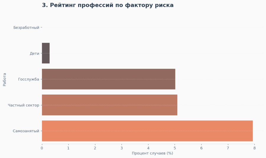 Затем я решила сделать анализ по профессиям, где выяснила, что фрилансеры и самозанятые (Self-employed) болеют чаще, чем сотрудники частных компаний. Вероятно, отсутствие нормированного графика и стресс — более сильные факторы риска, чем офисная гиподинамия.