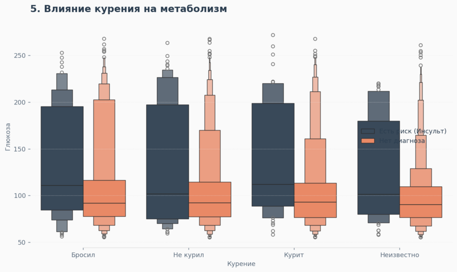 На этом графике я исследовала «хвосты» распределения. Интересно, что у группы риска (инсульт) медианный уровень глюкозы выше во всех категориях — и у курильщиков, и у тех, кто бросил. Это говорит о том, что высокий сахар — более универсальный маркер патологии, чем статус курения сам по себе.