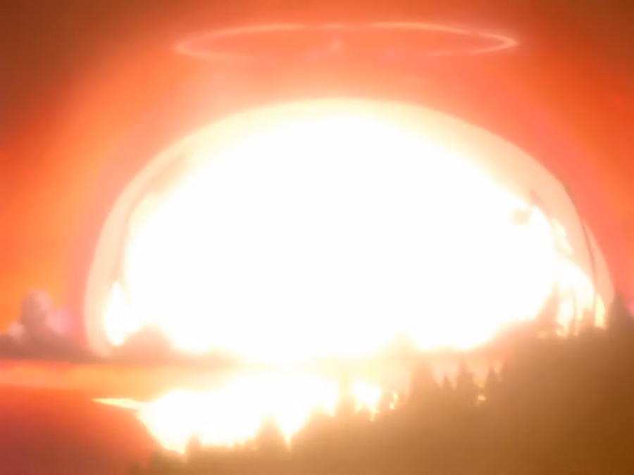 Сам взрыв показан как гигантский, поглощающий весь горизонт ослепительный огненный шар, который на мгновение затмевает собой небо. Он не выглядит как обычный взрыв оружия — это всепоглощающая сфера чистого света и энергии, визуализирующая акт абсолютного, тотального самоуничтожения. Масштаб этого явления вызывает не просто шок, а чувство благоговейного ужаса перед силой, которая может стереть себя из существования, оставив после себя лишь слепящую пустоту.