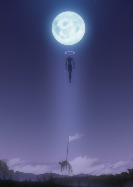 Гигантская, обнаженная Рей медленно поднимается с поверхности Земли. Ее размеры поистине планетарны — ее голова и плечи уже возвышаются над орбитой, а тело простирается вниз, к самому Геофронту. Этот непостижимый масштаб мгновенно делает все человеческие достижения — города, технологии, оружие — абсолютно ничтожными. Зритель, как и персонажи, чувствует себя микроскопической частицей перед лицом этого нового божества. Это чистейшее Математически Возвышенное, где чувства окончательно перегружены, и только разум может с трудом пытаться охватить этот масштаб.