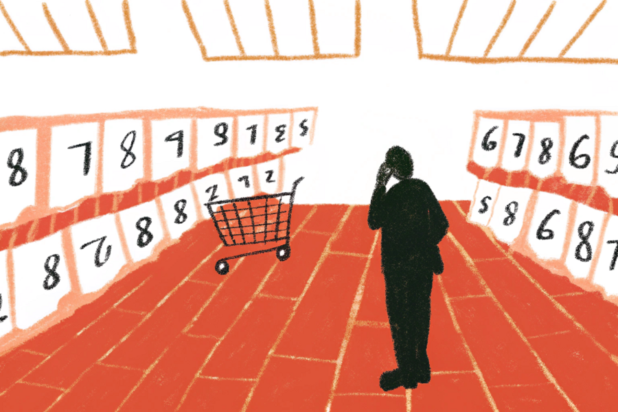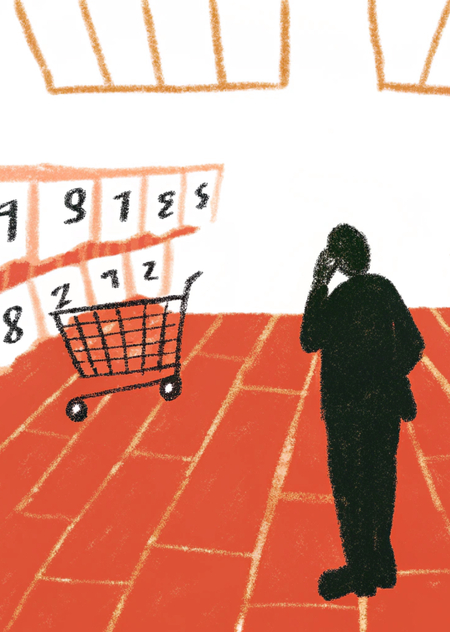 1. prompt: A person standing in a supermarket comparing prices, price tags turning into floating numbers and graphs, calm but thoughtful mood, modern illustration, soft lighting.