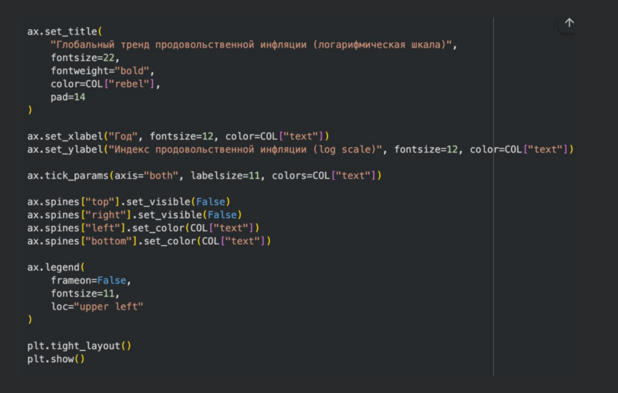 Во время анализа мне хотелось не просто построить графики, а попытаться понять, что стоит за ними: в какие периоды инфляция становится особенно нестабильной, где скачки цен происходят чаще всего и как глобальные кризисы отражаются на продовольственном рынке. Эти наблюдения стали основой для выбора визуализаций проекта.