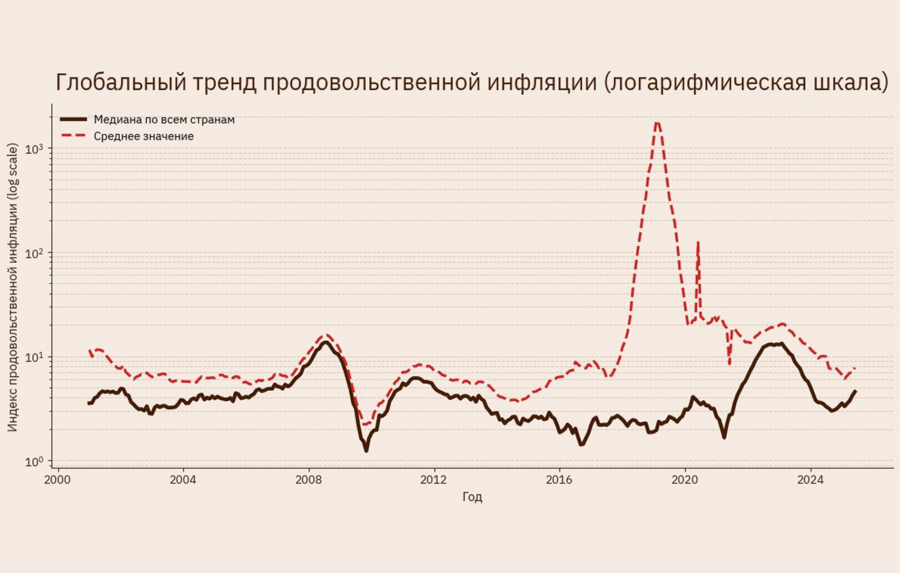 На графике хорошо заметно, что продовольственная инфляция развивается неравномерно: периоды относительной стабильности сменяются резкими скачками. В некоторые годы рост цен происходит плавно, однако в отдельные моменты линия резко уходит вверх, что указывает на кризисные периоды и усиление экономической нестабильности.