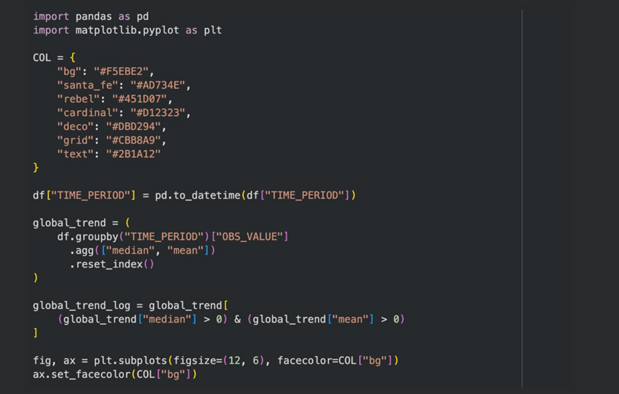 В качестве основы для анализа я использовала датасет Food Price Inflation, опубликованный на платформе Kaggle (https://www.kaggle.com/datasets/umitka/food-price-inflation). Он охватывает большой временной промежуток и содержит данные по продовольственной инфляции в разных странах. При работе с датасетом я постепенно начала замечать, насколько неравномерно распределены изменения цен и как сильно на них влияют внешние события.