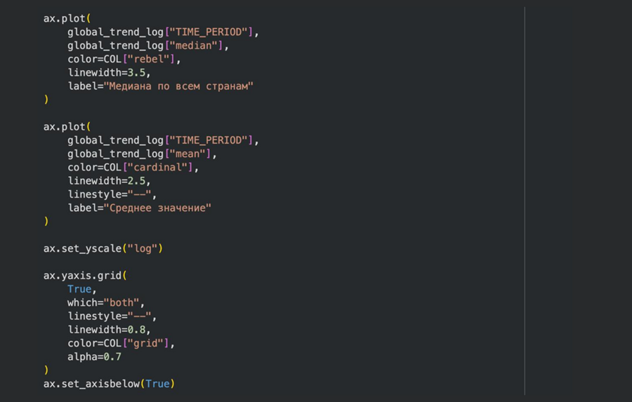 Описательная статистика — использовалась для расчёта средних и медианных значений индекса продовольственной инфляции во времени. Это позволило оценить общий глобальный тренд инфляции, а также сравнить чувствительность средней и медианной динамики к экстремальным значениям.