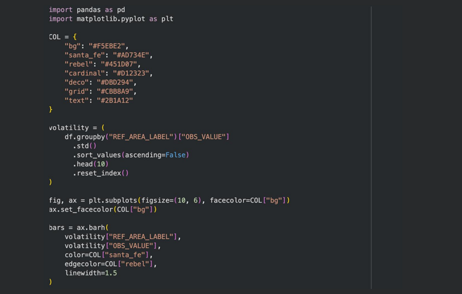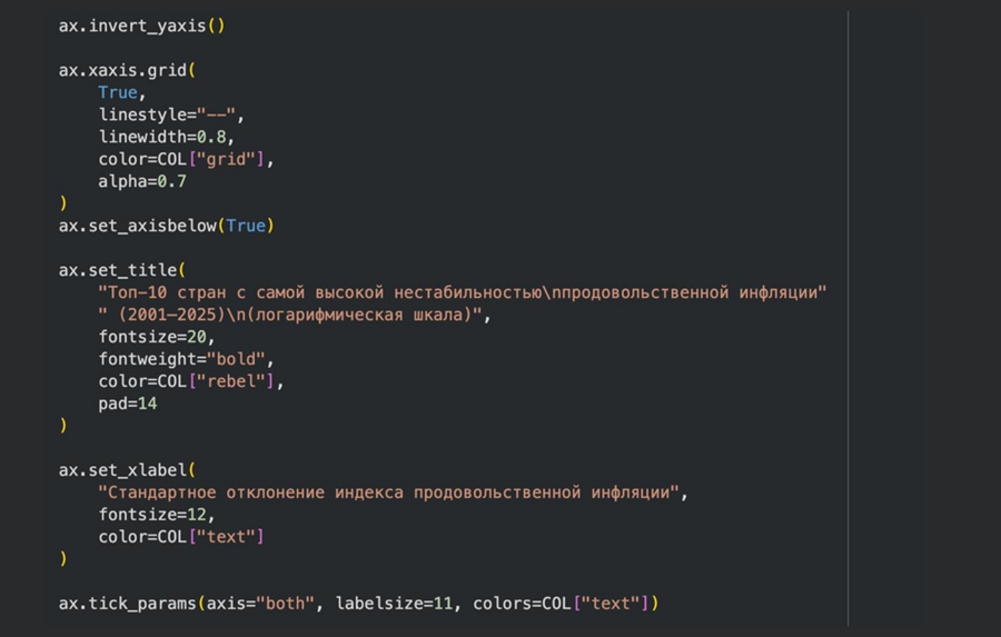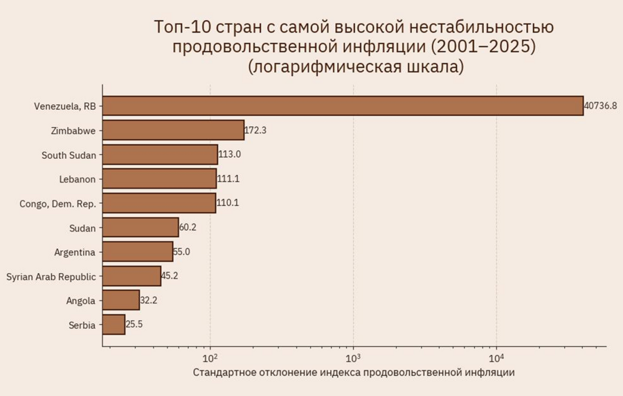 Анализ волатильности — проведён на основе расчёта стандартного отклонения индекса продовольственной инфляции по странам. Это позволило выявить государства с наибольшей нестабильностью цен на продовольствие за рассматриваемый период.
