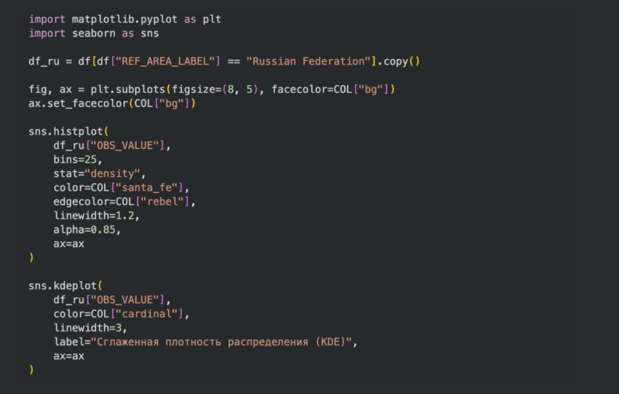 Анализ распределений — выполнен с использованием гистограмм и сглаженных кривых плотности (KDE) для оценки формы распределения продовольственной инфляции на примере отдельной страны. Это позволило проанализировать асимметрию распределения, концентрацию значений и наличие «длинных хвостов».