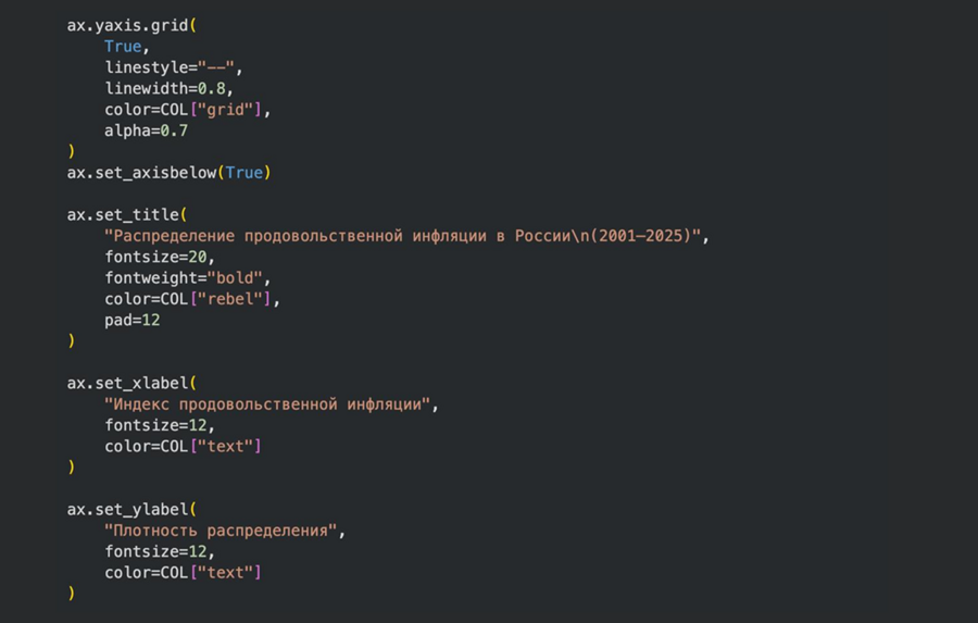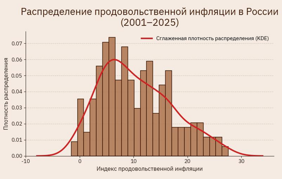 График показывает, что большая часть значений продовольственной инфляции в России сосредоточена в умеренном диапазоне. При этом распределение имеет смещение в сторону более высоких значений, что указывает на периодическое возникновение сильных скачков цен. Сглаженная кривая подчёркивает, что высокая инфляция встречается реже, но остаётся важной частью общей динамики.