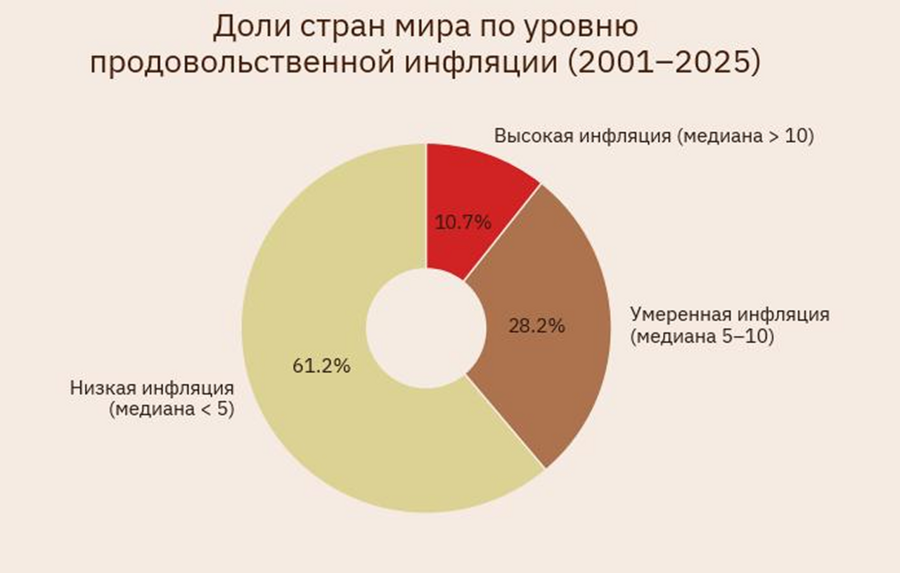 График показывает, что большинство стран в период 2001–2025 годов относятся к группе с низкой продовольственной инфляцией. При этом почти треть стран находится в зоне умеренного роста цен, а высокая инфляция характерна лишь для небольшого числа государств. Это доказывает неравномерность продовольственной инфляции в мире и наличие отдельных стран с повышенными рисками.