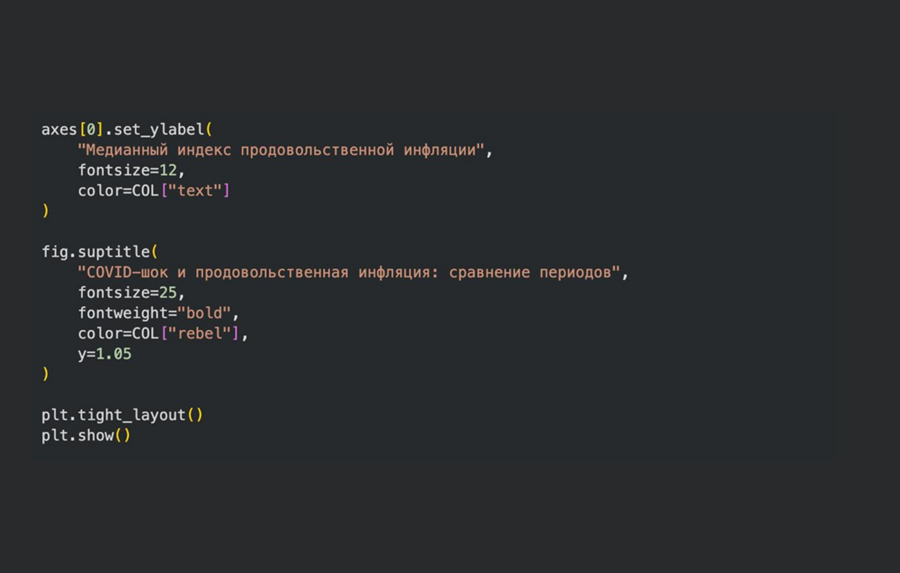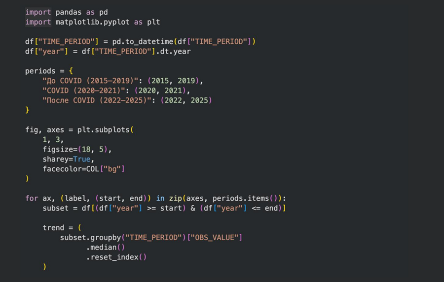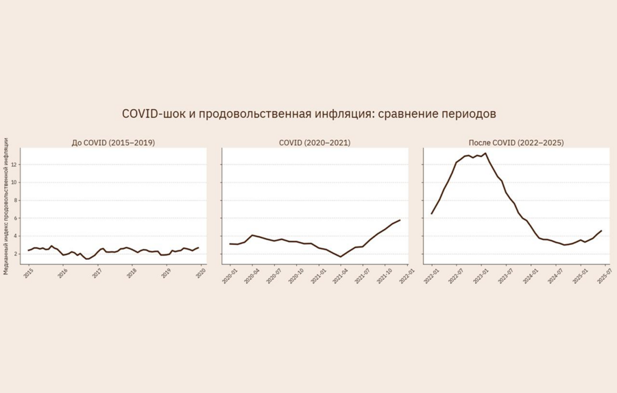 Периодизационный анализ — применялся для сравнения динамики медианного уровня продовольственной инфляции в различные макроэкономические периоды: до пандемии COVID-19, в период пандемии и после неё. Такой подход позволил оценить влияние внешнего шока на поведение показателя.