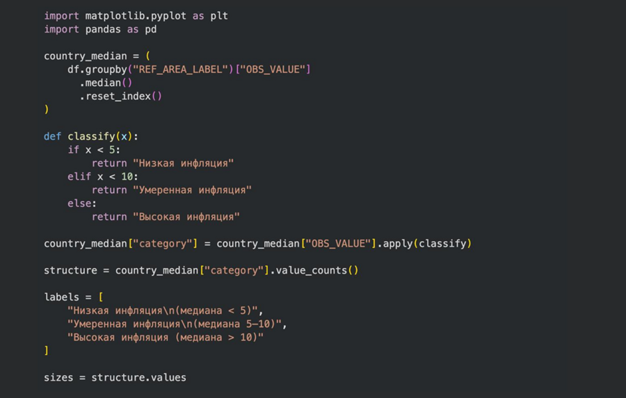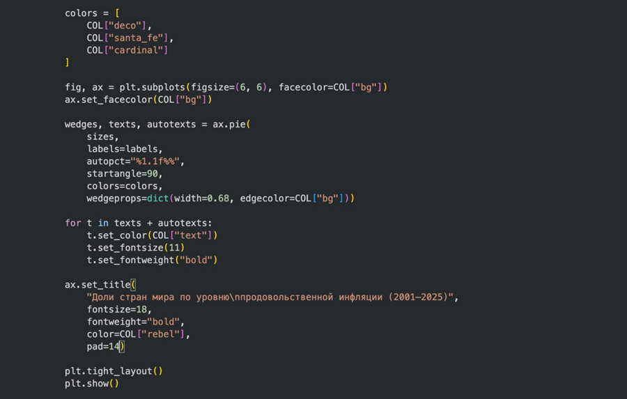 Структурный анализ — реализован с помощью круговой диаграммы, отражающей доли стран в каждой инфляционной категории, что позволило наглядно представить глобальную структуру продовольственной инфляции.