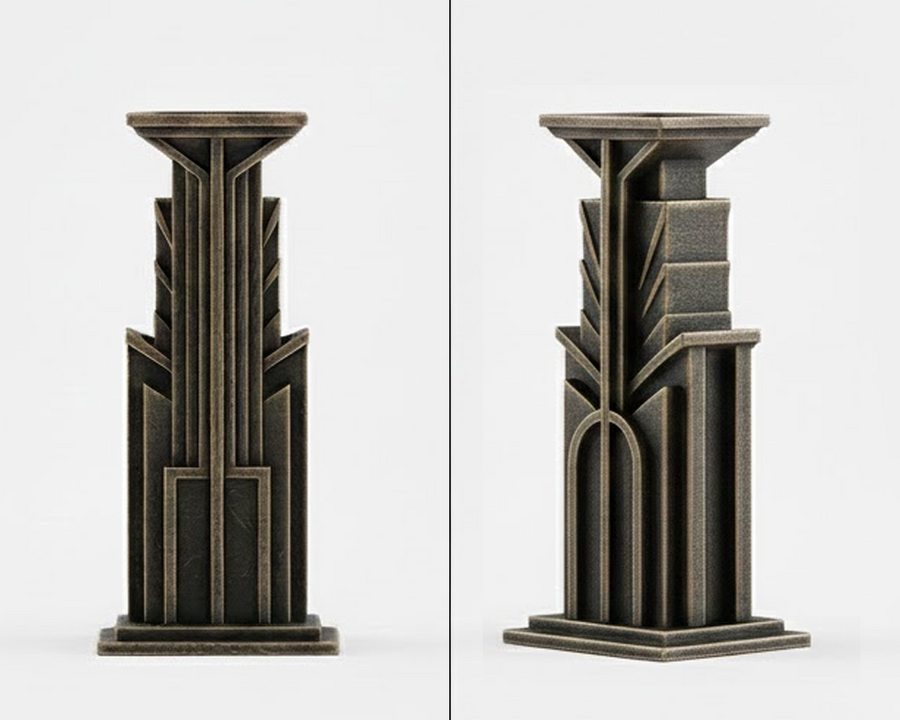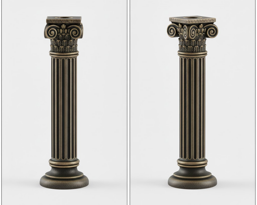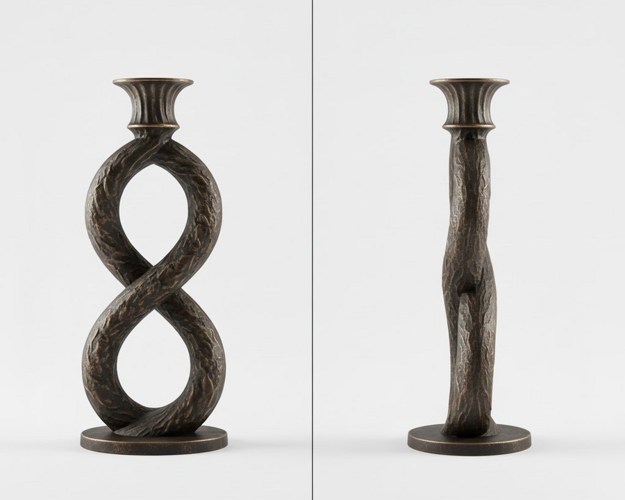 1. Единство Материала: Использование единого материала и финиша (например, бронзовое патинирование или текстура старого камня) визуально связывает совершенно разные эпохи в единую коллекцию, подчеркивая их общее культурное наследие. 2. Диалог Эпох: Расстановка этих подсвечников рядом создает визуальный «разговор» между античной мощью, средневековой устремленностью, барочной пышностью, викторианской спиралью и современным арт-деко. 3. Символизм: Каждый подсвечник — это не просто декор, а символ: Колонна — начало, основа; Готика — вера и стремление вверх; Ваза — расцвет культуры и Ренессанс; Завиток — динамика модерна/барокко; Геометрия — современный прогресс.