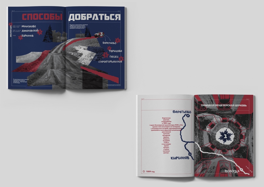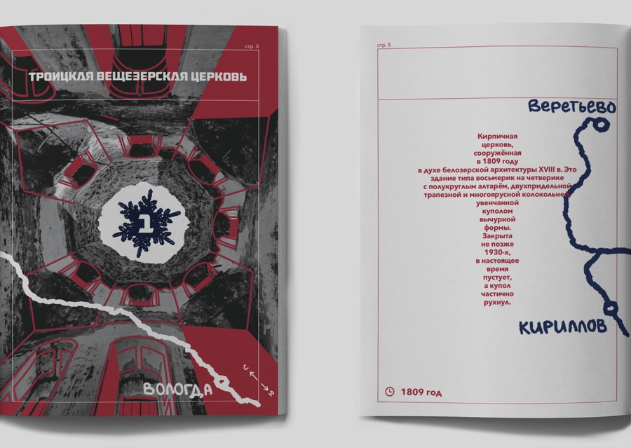 Путеводитель по заброшенным церквям Вологодской области помогает глубже исследовать глубинку страны и погрузиться в культуру области. Метафора бренда состоит в использовании карты региона, трещин, символизирующих разрушающиеся церкви, и снежинок, ассоциирующихся с северной местностью.