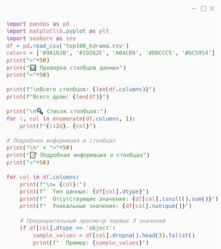 Процесс генерации графических изображений с использованием библиотеки pandas в Google Colab включал несколько этапов. На первом этапе с помощью AI-помощника DeepSeek было определено, какие элементы CSV-файла подходят для анализа, а также создан dataframe (df) для структурирования данных. Затем был выбран тип графика, наиболее эффективно отражающий полученные значения, после чего с помощью DeepSeek был сгенерирован код для его визуализации.