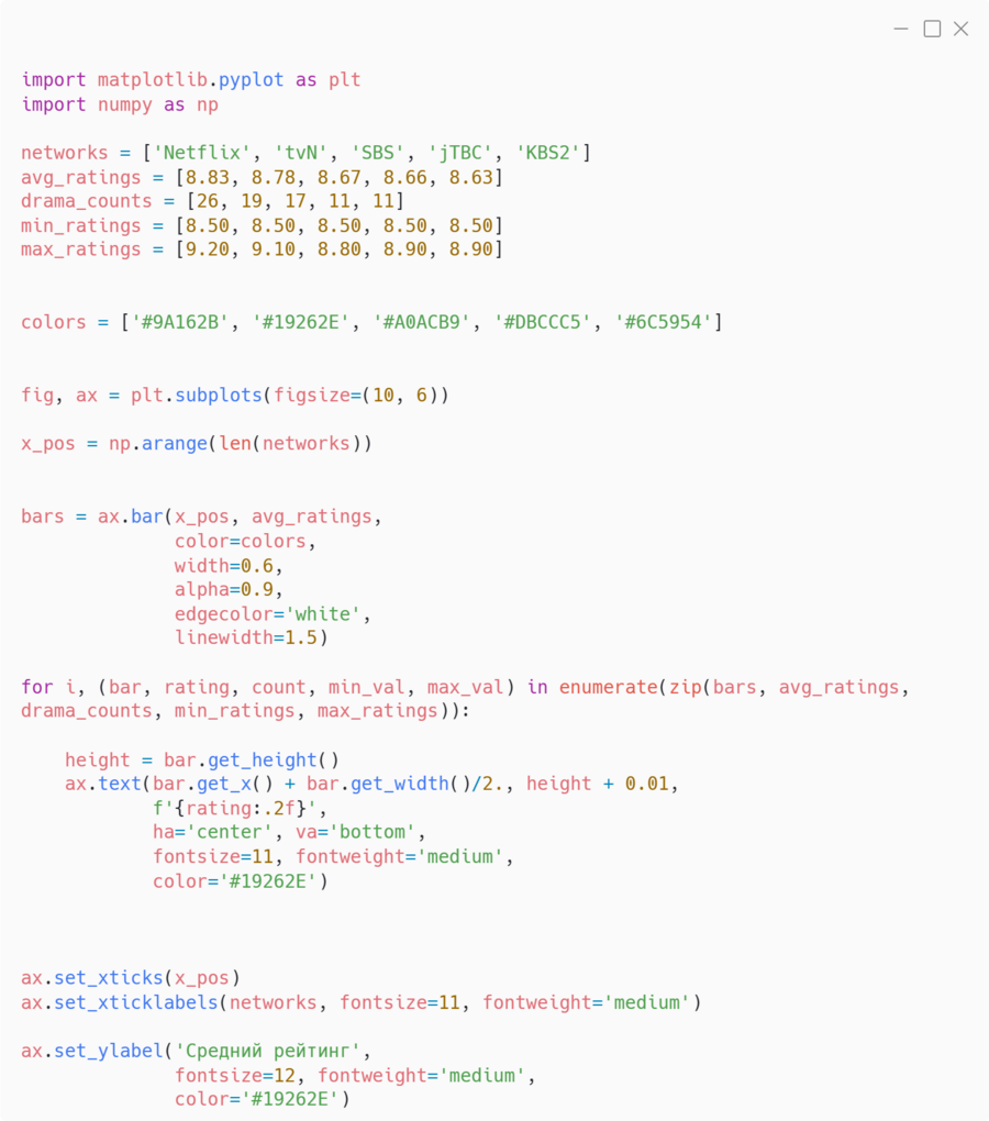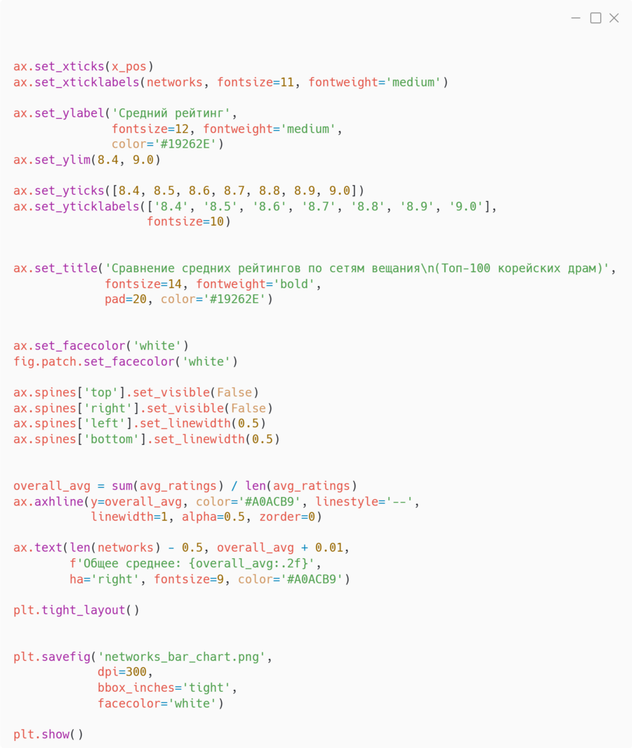 Гистограмма отображает сравнение рейтингов драматических сериалов в зависимости от телеканалов и стриминговых платформ. Этот график позволяет определить, какие платформы производят контент, пользующийся наибольшей популярностью среди зрителей. Кроме того, он демонстрирует средний рейтинг контента каждой платформы, а также общий средний рейтинг всех включённых в анализ сериалов.