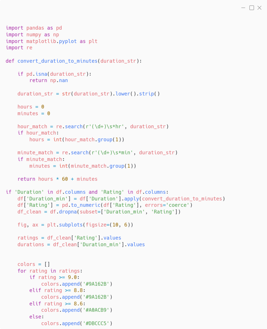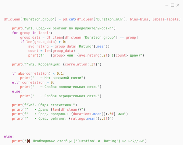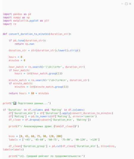 На основе представленных графиков были проанализированы наиболее распространённые жанры в топ-100 корейских сериалов, предпочитаемые зрителями платформы для просмотра дорам, взаимосвязь между продолжительностью сериалов и их рейтингами, а также динамика рейтингов по годам.