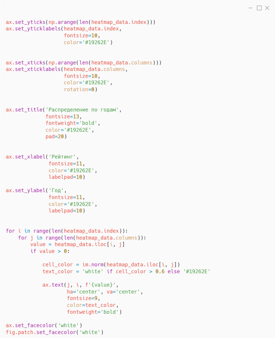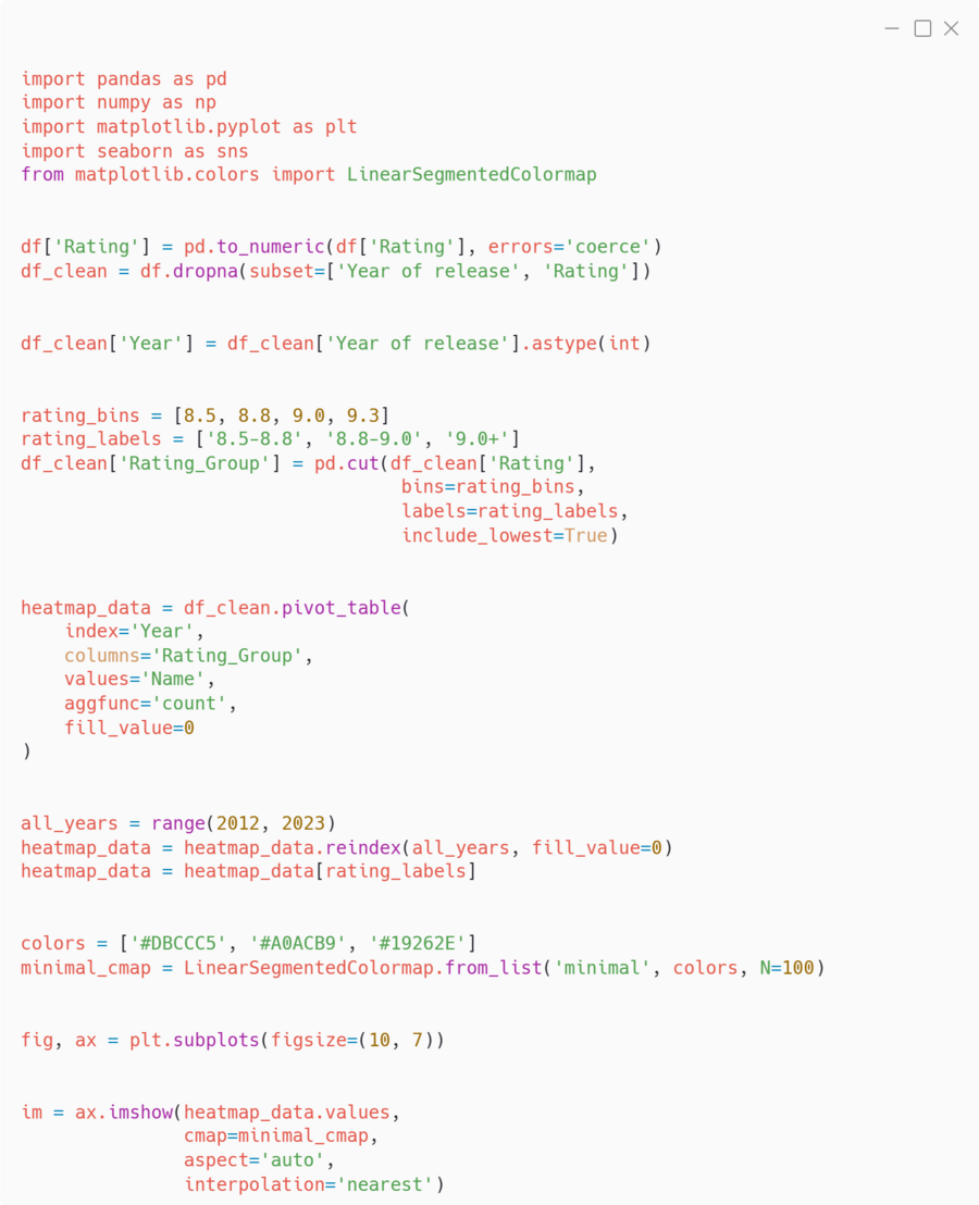 Наконец, тепловая карта отражает распределение драматических произведений по годам и рейтингам. С помощью цветовой палитры данный график позволяет быстро определить, сколько сериалов с определёнными рейтингами выходило в разные годы.