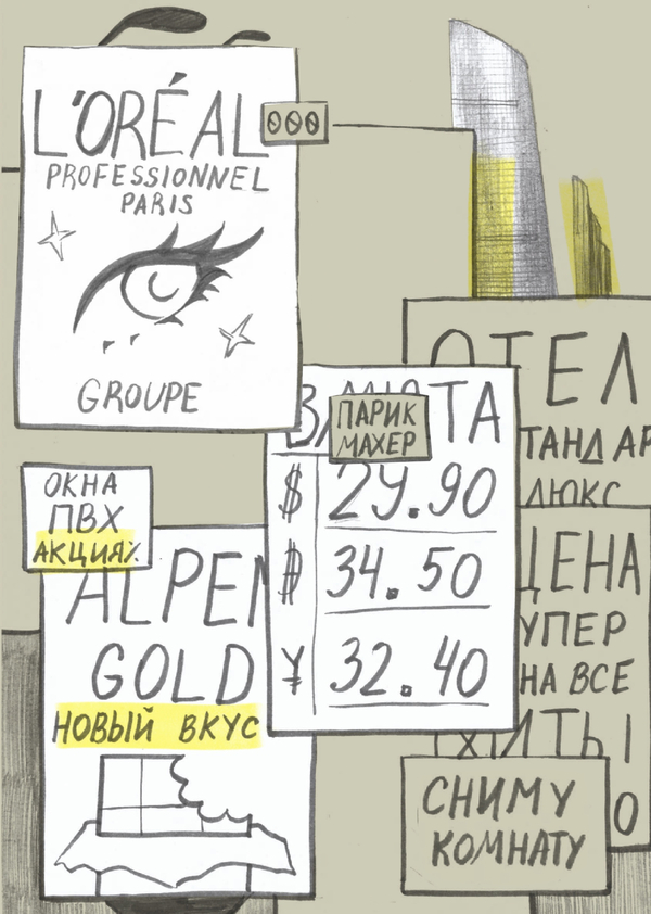 Зин «Рекламный слой» показывает Москву 2010-х: облепленную объявлениями с асфальта и до самых вершин сталинских высоток, прячущуюся за рекламными постерами и кричащую громкими слоганами на тонких флаерах.