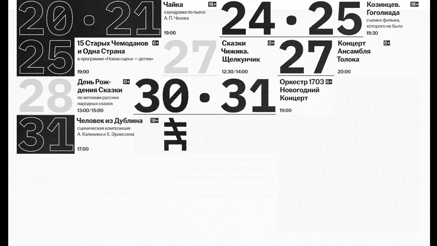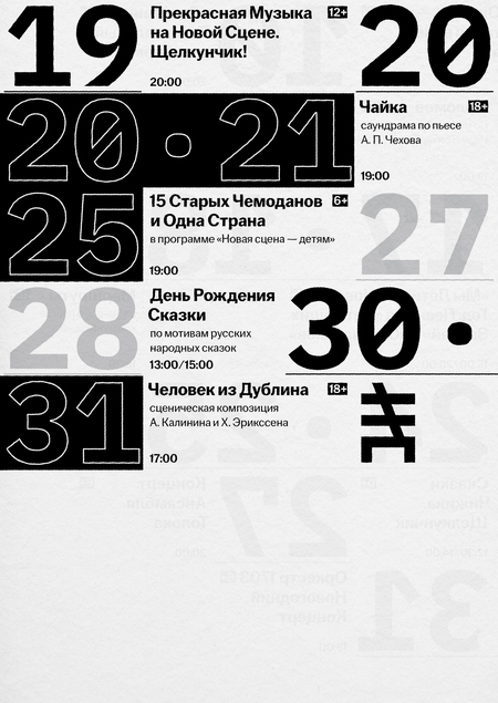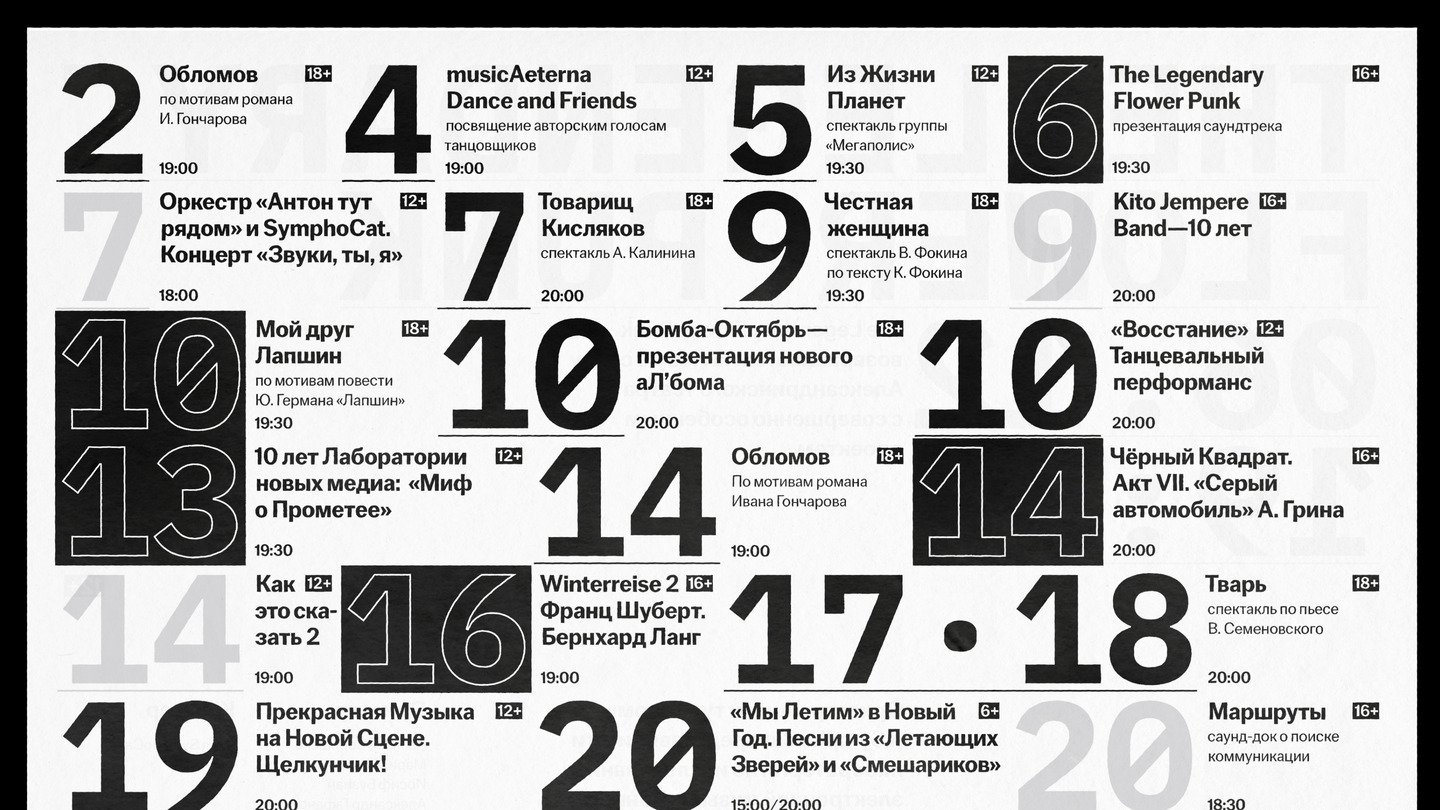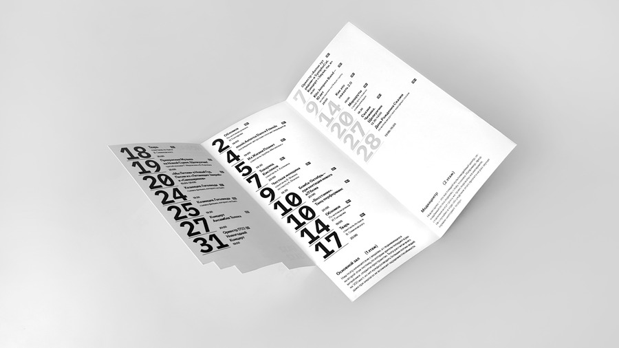 Верстка отсылает к архитектуре здания и зонированию залов — блоки мероприятий стыкуются друг с другом, неравномерно покрывая пространство носителя.