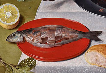 В некоторых работах рыба и мясо соседствуют, создавая смысловые контрасты.