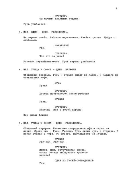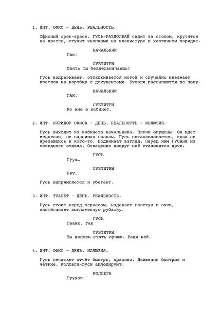 Гусь работает на нелюбимой должности, и единственное, что его радует — это гусыня, которую он встречает в офисе. Эта тайная влюбленность становится для гуся двигателем, толкающим его на изменение своей жизни.