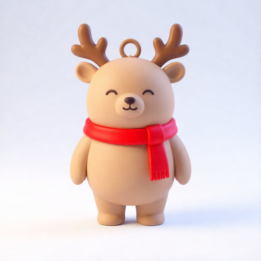 1. Концепция: Генерация промптов для эскизов в Perplexity, генерация фотографий эскизов в Qwen. 2. Моделирование: Создание 3D-геометрии в Hunyuan на основе эскизов. 3. Подготовка: Проверка и настройка параметров печати в слайсере Form Ware. 4. Создание промо материалов при помощи Leonardo AI и Recraft. (Пример промпта: a realistic top-down photograph of an open small gift box, the lid placed to the side, inside the box lies a single cute minimalist reindeer Christmas ornament with chibi proportions, big rounded body, small head, simplified thick antlers, tiny ears, closed smiling eyes as curved lines and a small dark nose, wearing a bright red scarf and having a small loop on top of its head for hanging, the ornament is nestled in soft white tissue paper or shredded kraft paper, warm cozy Christmas lighting, wooden table under the box, subtle fir branches and blurred festive decor around, high resolution holiday product photo)