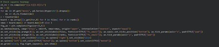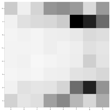 Диаграмма показывает, на какую клетку чаще всего встают фигуры игроков. Можно заметить, как клетки, где начинают фигуры почти не используются в партиях и на самом деле, вся игра разворачивается в прямоугольнике посередине. В особенности — центральный квадрат.