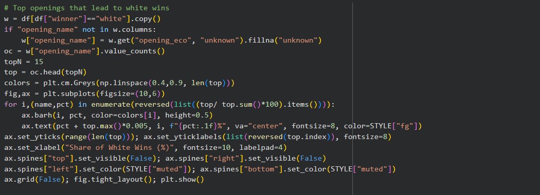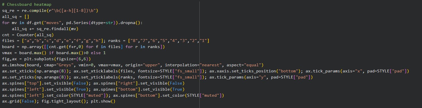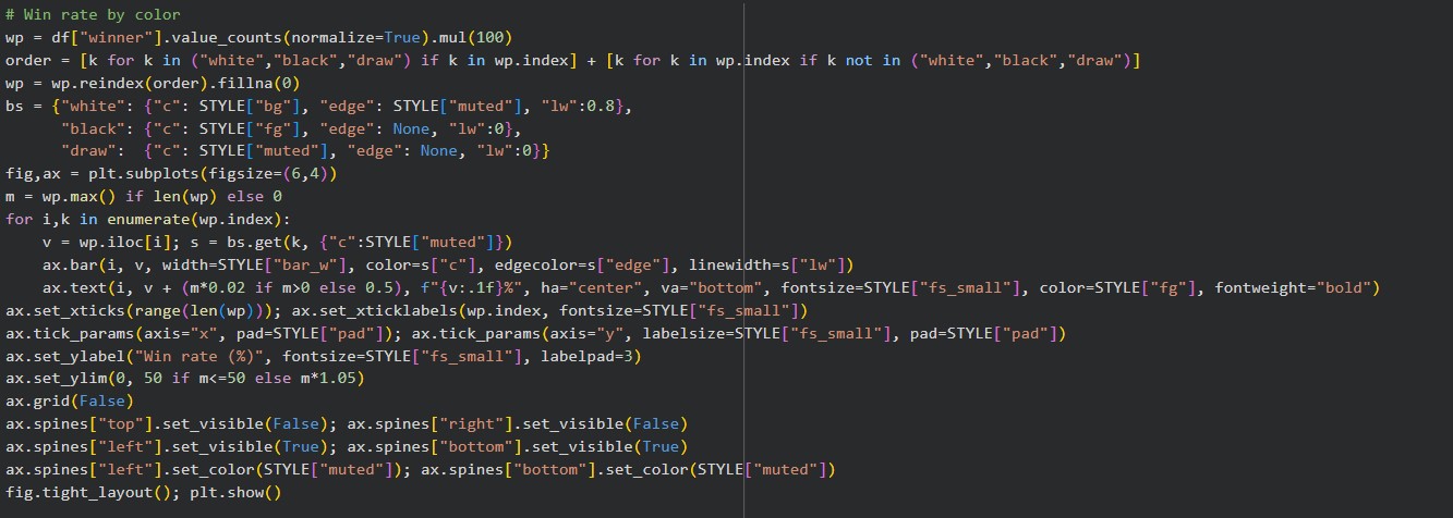 С сайта Kaggle была взята таблица с 20 000 шахматных партий. На её основе изучены паттерны хода игры, позволяющие увидеть общие характерные особенности такой эмерджентной игры как шахматы.