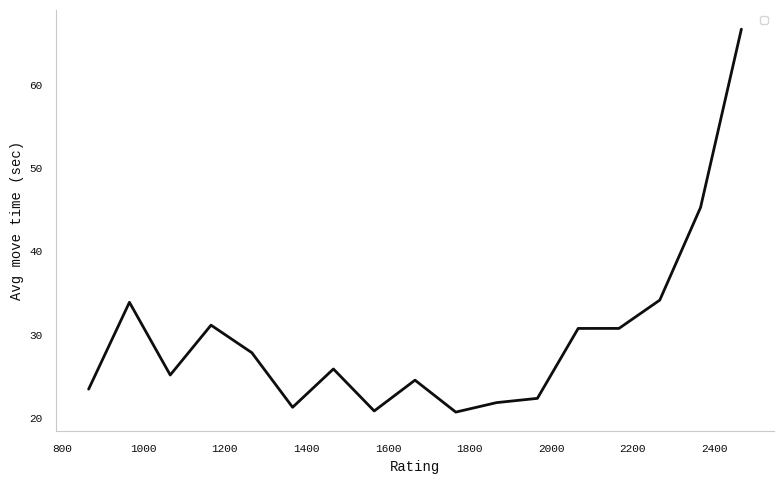 График учитывает длительность партии и количество сделанных в ней ходов. На основе этого строит среднее время раздумья над своим действием в зависимости от рейтинга. Можно заметить, что две наивысшие точки — в начале и конце рейтинга. Можно предположить, что в начале игроки долго думают из-за неуверенности, а в конце из-за сложности решения. Меньше всего тратят времени на ход середина рейтинга, там же и находится большинство игроков.