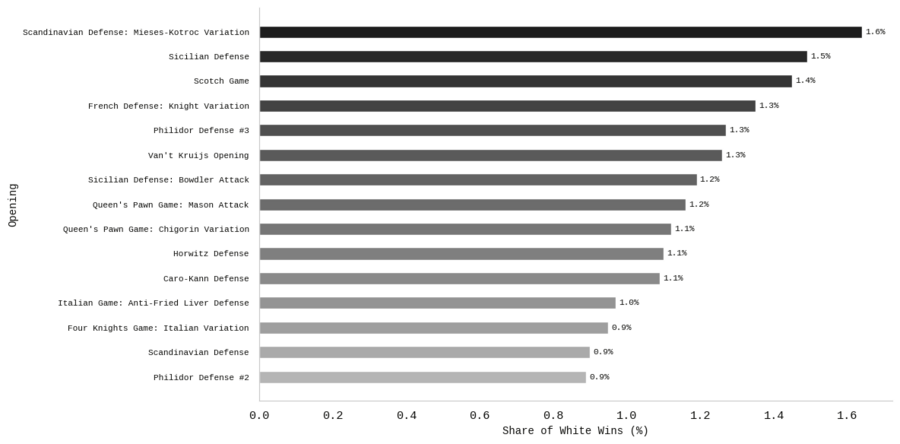 График показывает топ дебютов, которые приводили игрока к победе. Можно заметить, что почти все лучшие дебюты первым делом занимают клетки, отмеченные раньше как самые «горячие». Лучше всех себя показала вариация скандинавской защиты.