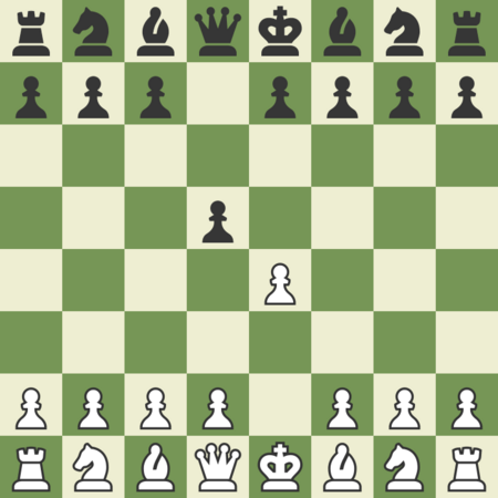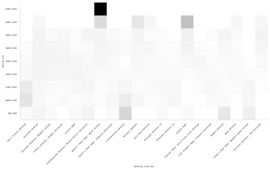 На графике изображена популярность разных вариантов дебютов на разном рейтинге игры. Можно заметить, что вариация «игры королевской (ферзевой) пешкой» является самым популярным дебютом в общем и подавляюще популярным на высоких рейтингах. В топе самых выигрышных дебютов она занимает 8 место, и её популярность растёт поступательно с ростом рейтинга.