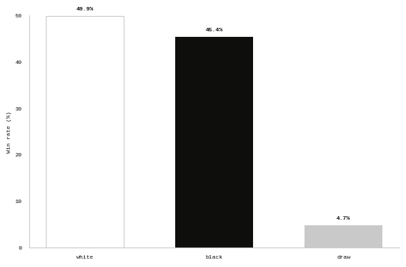 В заключение можно отметить, что в шахматных партиях игрок за белых имеет незначительное преимущество. Но на более высоких рейтингах, эта разница сокращается почти до нуля.