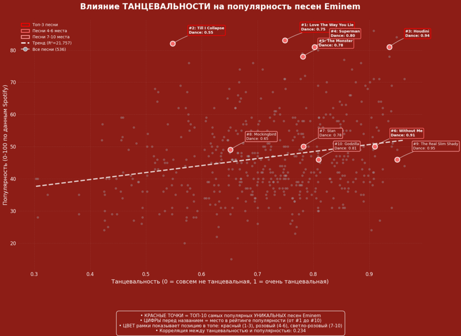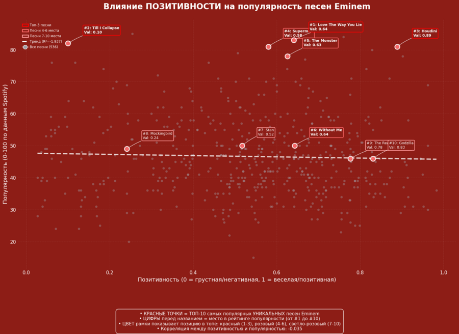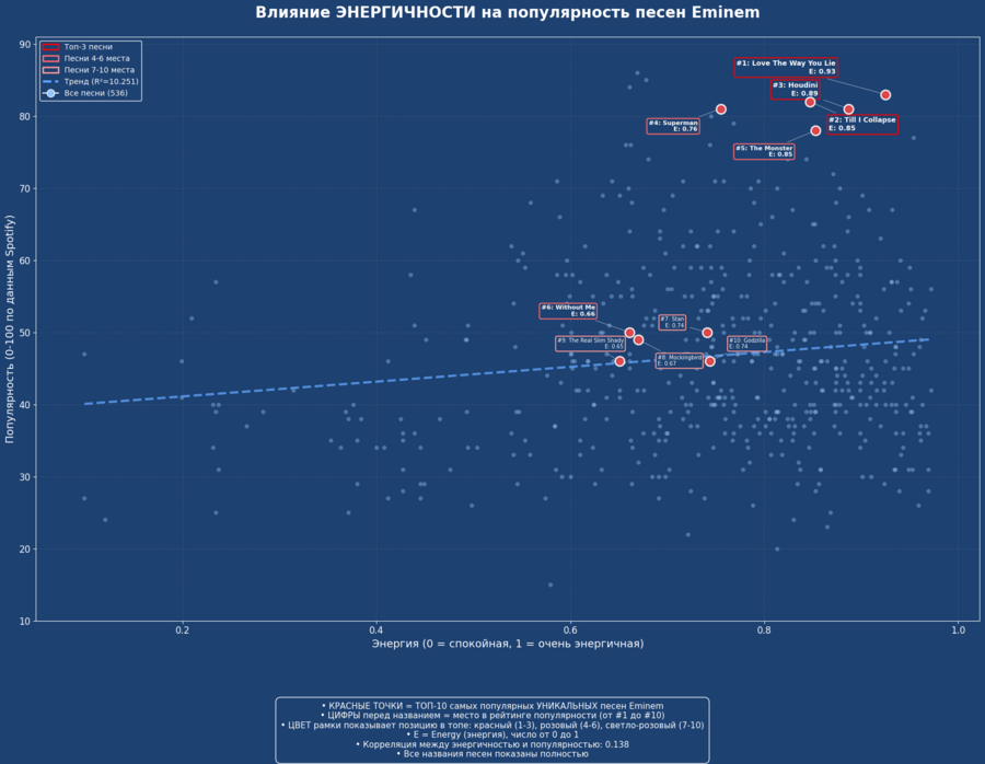 В ходе подробного исследования датасета о творческой деятельности Эминема, я создала 7 диаграмм, которые наглядным образом отображают то, как различные факторы повлияли на уровень популярности его песен. Таким образом, самыми известными песнями стали «Go to sleep», «8 mile», «Is This Love (’09)», «Is This Love (’09) (feat.50 Cent)».