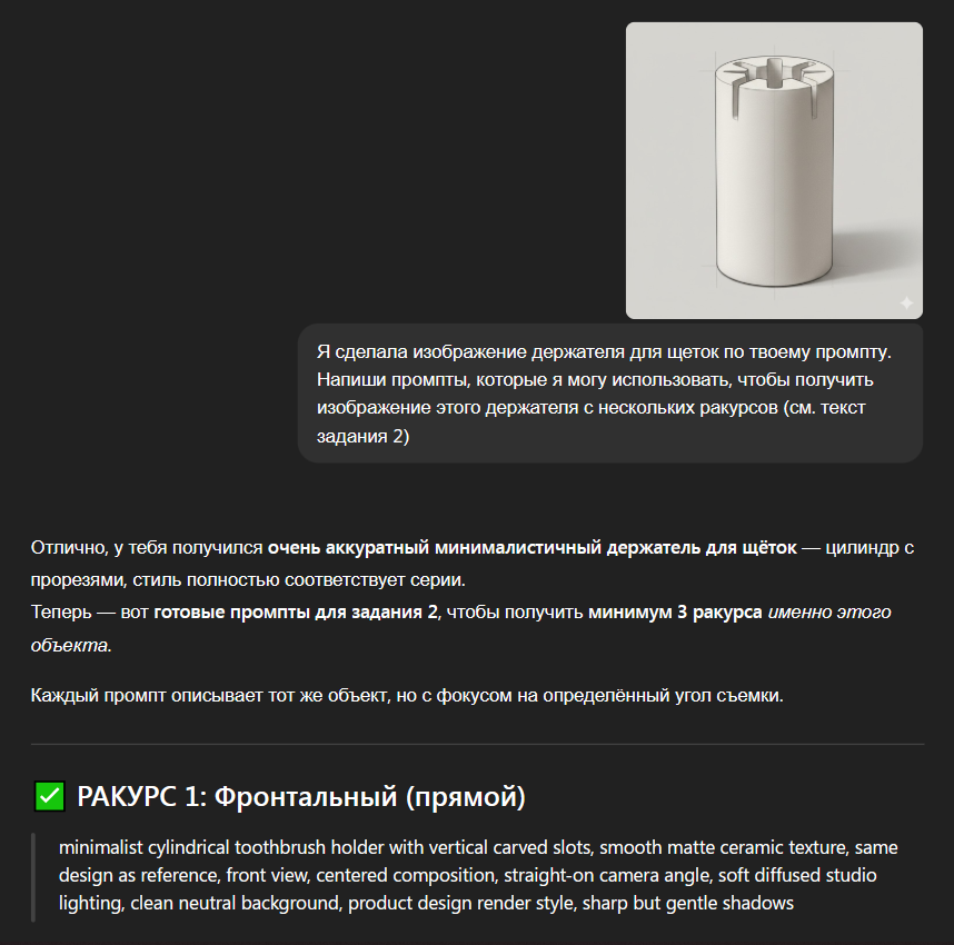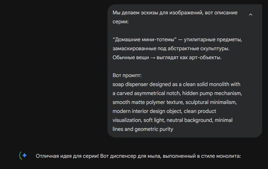 Этап 1. Формулировка требований Сначала были зафиксированы ключевые критерии объектов: утилитарность, минимализм, монолитная форма, нейтральный материал и потенциальная пригодность для 3D-печати. Генерации рассматривались как часть дизайн-процесса, а не как поиск случайных визуалов.