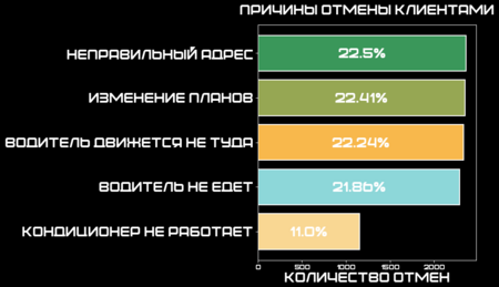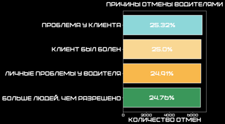 В совокупности 75,08% отмен поездок таксистами происходит из-за клиента (из-за разного рода проблем с ним — будь то болезнь, несоответствие количества пассажиров и т. п.) и 24,2% из-за личных проблем. Клиенты же отменяют поездку в 44,9% из-за личных проблем (указали неправильный адрес или изменились планы) и в 55,1% из-за действий водителя (едет не по направлению точки заказа или не едет вообще) или дискомфорта в салоне (если не работает кондиционер).