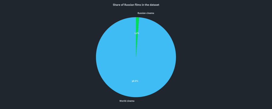 Российское кино занимает очень небольшую долю датасета — около 1%, тогда как подавляющее большинство фильмов относится к мировому кино. Я буду учитывать это при дальнейшем сравнительном анализе, так как российская выборка значительно меньше и менее репрезентативна.
