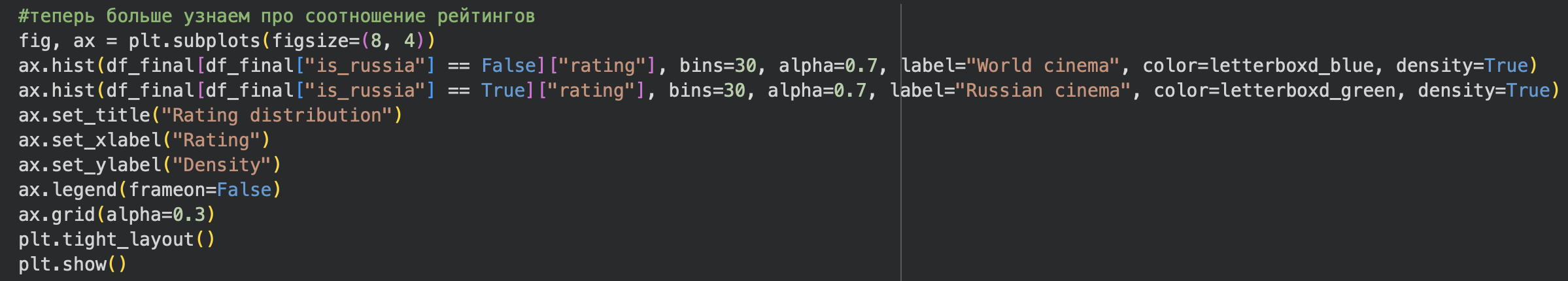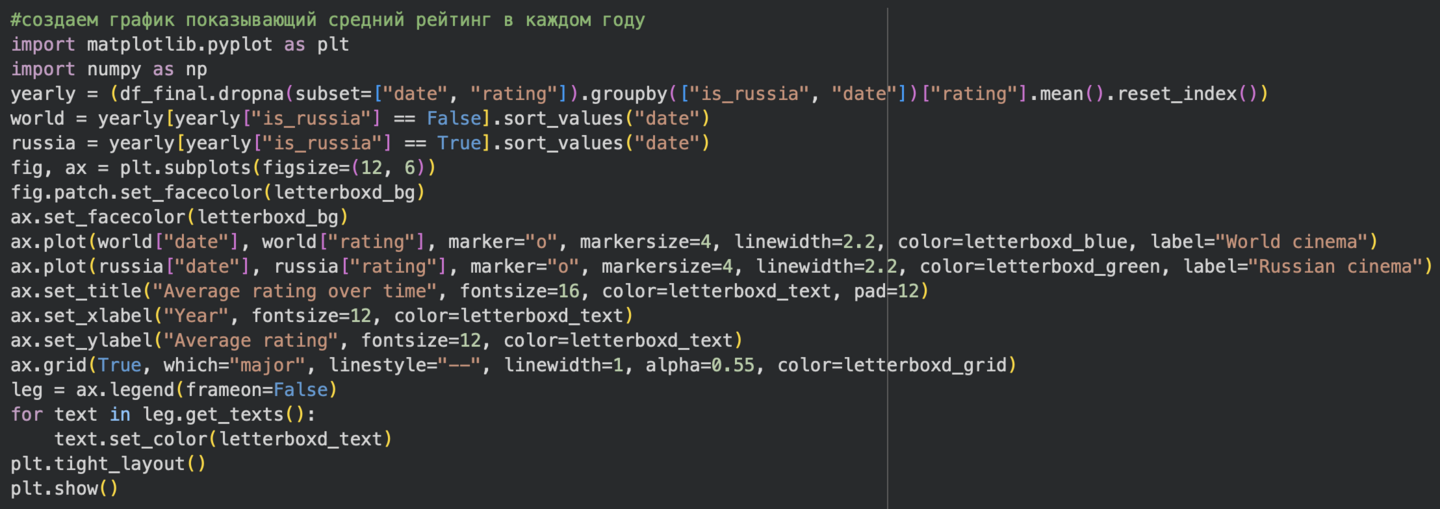 Перед созданием графиков мне надо было пройти этап предобработки данных. Сначала я взял основной датасет movies и последовательно присоединил к нему связанные таблицы (страны, жанры и темы) по идентификатору фильма. Так как один фильм может относиться к нескольким странам, жанрам и темам, я агрегировал эти значения в списки. После этого я добавил бинарную колонку is_russia, которая показывает, относится ли фильм к российскому кино, чтобы упростить сравнение российского и мирового кино в дальнейших графиках.