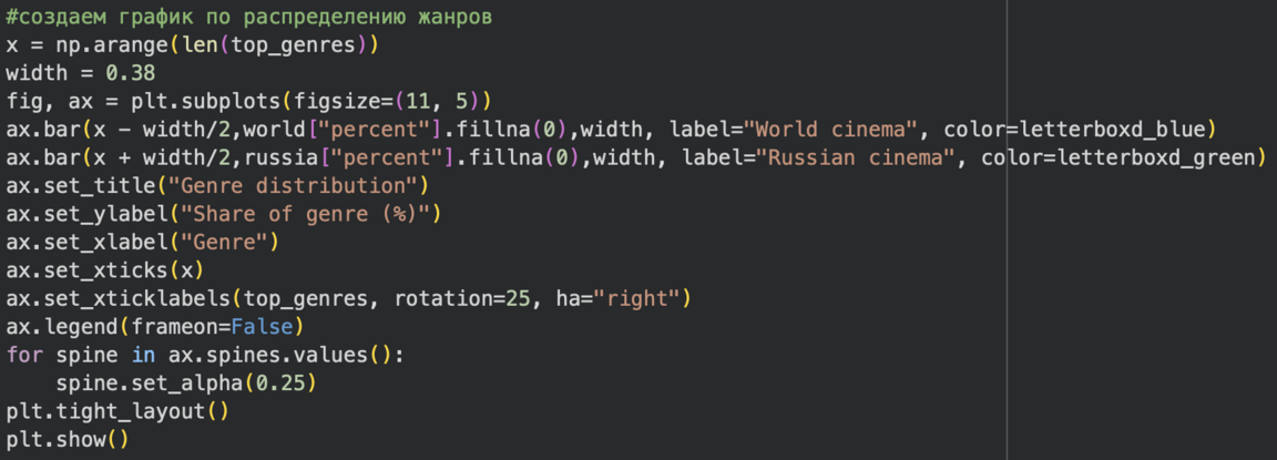 3. Столбчатая диаграмма — чтобы сравнить популярность конкретных жанров в мировом и отечественном кино.