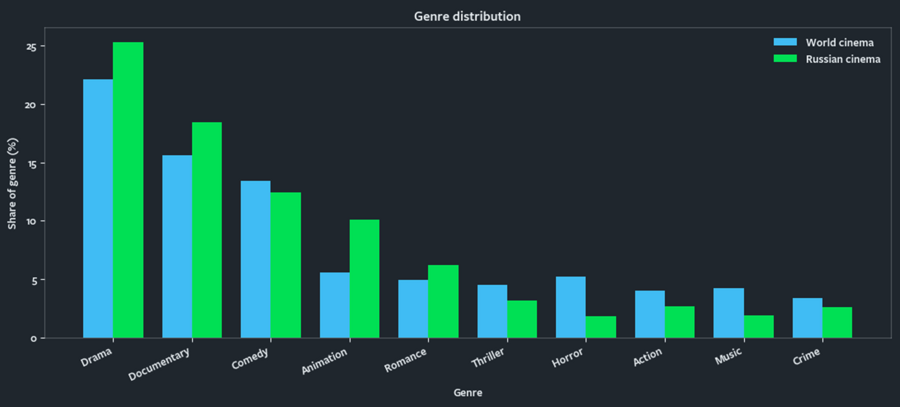 Жанровые распределения российского и мирового кино демонстрируют схожую структуру, однако отличаются по относительным частотам в отдельных жанрах. В российском кино наблюдается более высокая доля драмы, документального кино и анимации, тогда как в мировом кино сравнительно выше представлены хоррор, триллер, экшен и криминал.