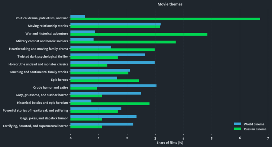 В российской выборке значительно выше концентрация тем, связанных с политикой, войной, патриотизмом и историческим героизмом. В мировом кино более равномерно представлены темы ужасов, чёрного юмора и психологических триллеров, что говорит нам о большей тематической диверсификации. В целом, распределения имеют разные «профили», отражающие различия в культурных и нарративных приоритетах.